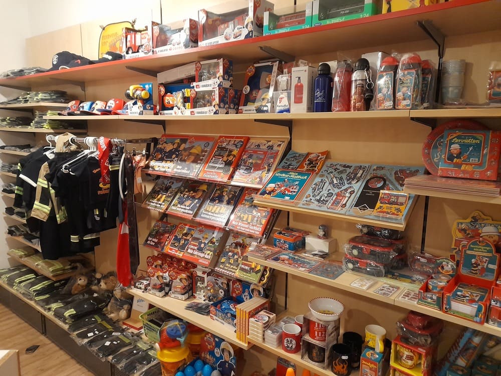Feuerwehrartikel mit dem Rund Logo der Feuerwehr, Siku Serie, Tassen, Cap s, T-Shirts, Feuerwehrmann Sam Artikel, Krawatten, Gürtel usw.